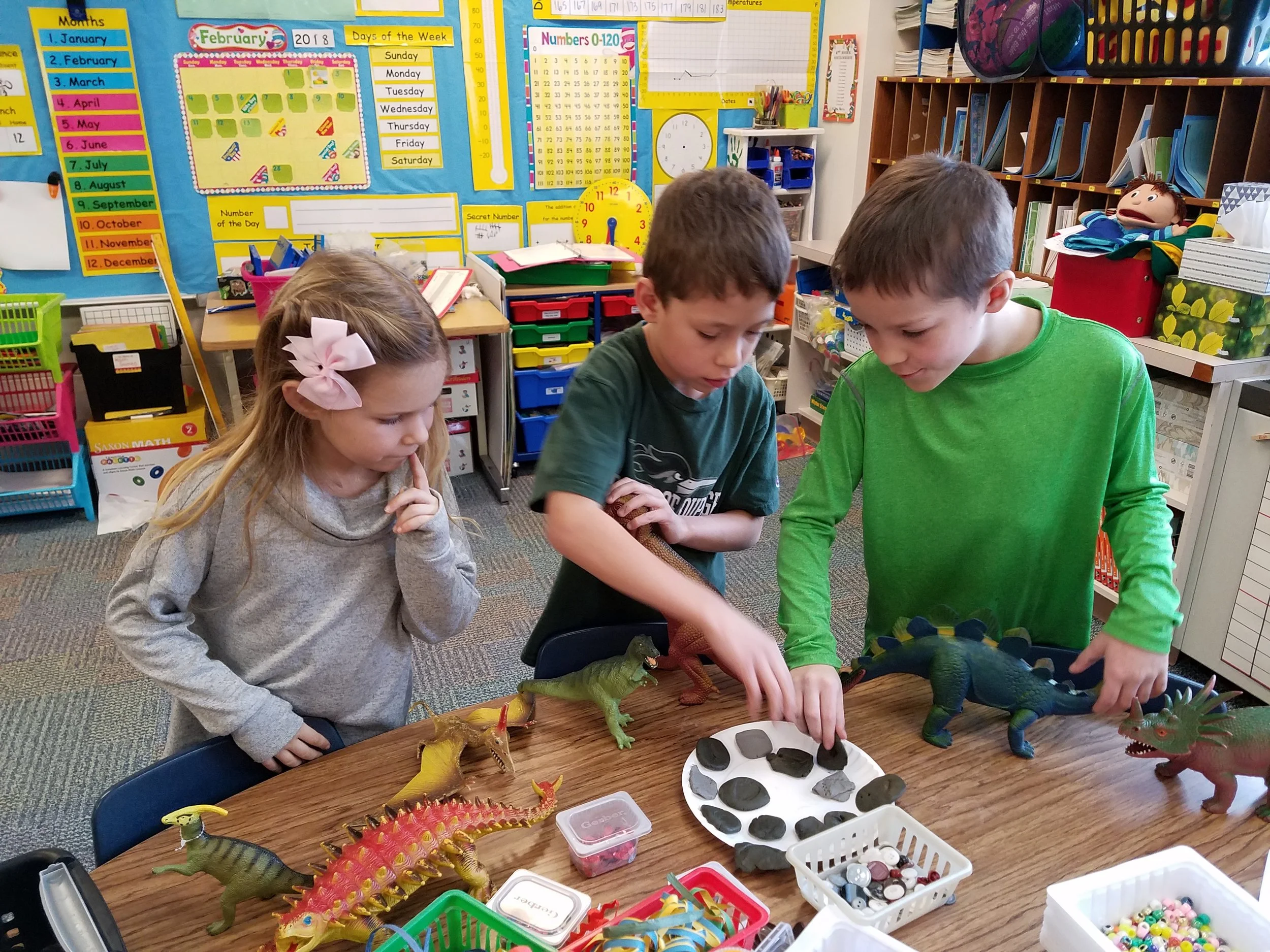 We enjoyed several activities to end our unit on fossils and dinosaurs. We imagined what like might be like if dinosaurs were still alive today, we played a computer game to construct a dinosaur and see how it might survive in the wild, we made instant imprint fossils in clay and tried figuring out what dinosaurs made what prints, we looked at some real fossils, and practiced our paleontology puzzle skills.